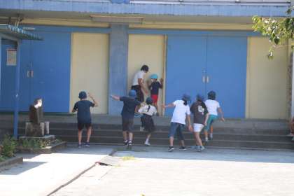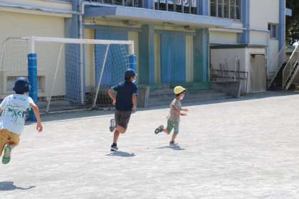 校庭で遊びが始まりました。鬼ごっこやだるまさんがころんだなど、一緒に楽しそうです。