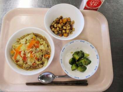みそラーメンはリクエスト給食です。献立表を見て、こどもたちは何日も前からみそラーメンが給食に出るのを楽しみにしてくれていました。おまめかりんとうには大豆が入っているので見た目で苦手だと感じる子もいましたが、食べたら甘くておいしいとおかわりしてくれていました。写真はラーメンの麺を蒸した後、配缶しているところです。