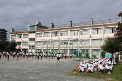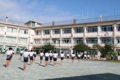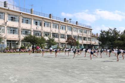 全校朝会で今週の目標は「練習も勉強もメリハリ付けてがんばろう。」だと、話がありました。写真は、6年生の運動会練習の様子です。まさしく、メリハリのある姿勢です。