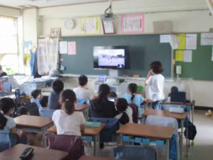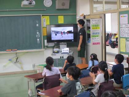 教室で映像を見ながら演奏を聞いている様子です。