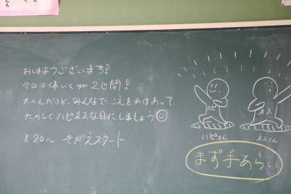 朝子どもたちを迎える2年生の教室黒板には、担任の先生からの熱いメッセージが書いてあります。
