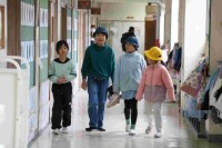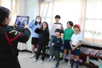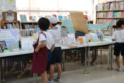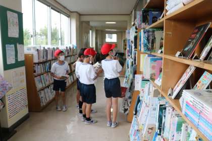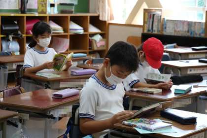 3年生図書の様子です。砧小学校では、図書室で向かい合わせに着席したり、密になることを考え、図書室で借りた本を教室で読んでいます。図書室には季節や、学習内容に関する本の紹介コーナーがあり子供たちが初めての本でも手に取りやすいように工夫されています。
