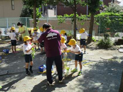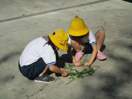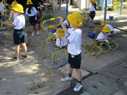 1年生が朝顔のつるでリース作りを行いました。支柱からつるをはずすのがとても大変でしたが、素敵なリースができてみんな満足そうでした。用務主事さんにも手伝ってもらいました。