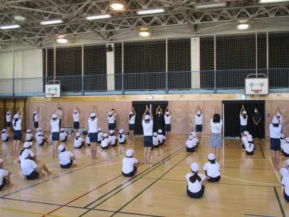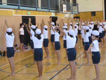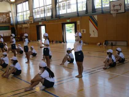 5年生の運動会の表現運動の練習風景です。列ごとに手の動きをずらして踊る練習でした。みんな先生の説明を真剣に聞きながら集中して取り組んでいました。