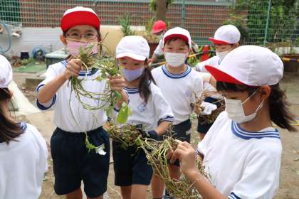 1年生がアサガオの弦でリースを作っています。支柱から外すのも一苦労です。友達同士助け合いながら活動している様子が微笑ましいです。
