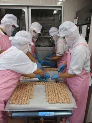 写真は肉団子入り春雨スープに入れる肉団子を作っているところです。みんなにいきわたるように小さく丸めて、たくさん作っています。このスープもとても人気があります。