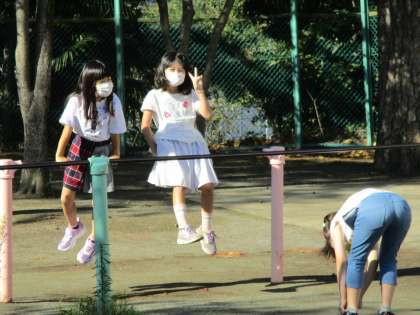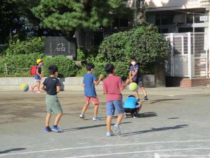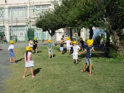 朝遊びの時間です。台風一過の快晴の空の下、元気に外遊びをしています。