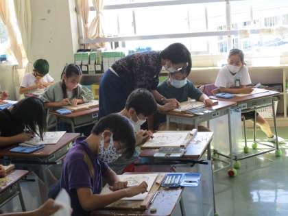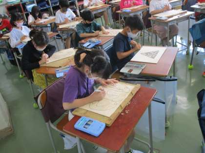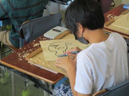 4年生の図工の授業です。彩色木版画を製作しています。今日は版木を彫刻刀で削る作業です。彫刻刀の種類を使い分けて上手に模様を削りだしていました。