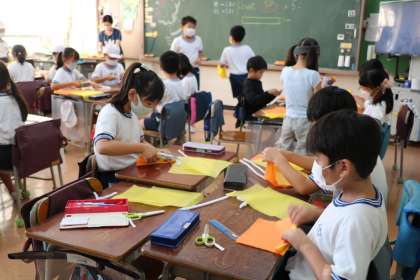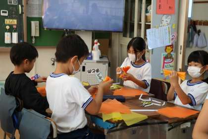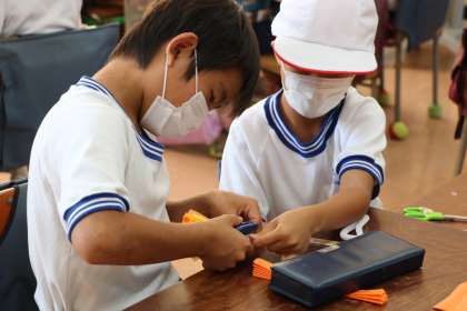 3年生、花笠を作っている様子です。友達と協力しながら作業を進めています。