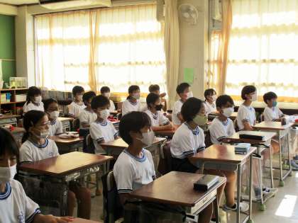 教室で放送朝会を聞いている様子です。