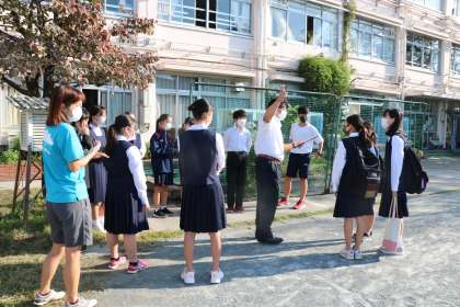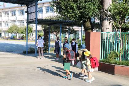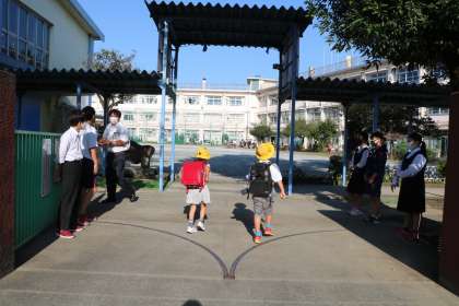 今日は「あいさつデー」です。砧中学校の中学生ボランティアのお兄さん、お姉さんが来てくれました。みんな集合した後、幼稚園門と正門に分かれて小学生を迎えます。