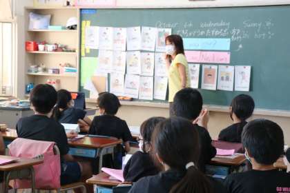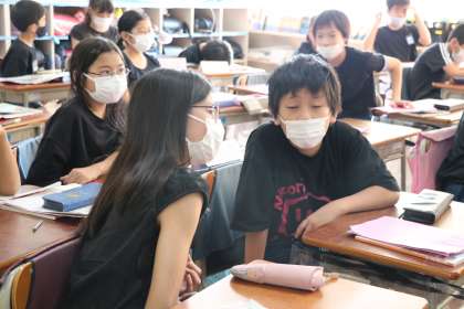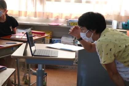 5年生外国語の学習の様子です。〜ができますか?はいできます。いいえできません。という言い方を知り、隣の友達と実際に会話してみます。外国語の先生もオンラインでつながっている子ども達と会話の練習です。