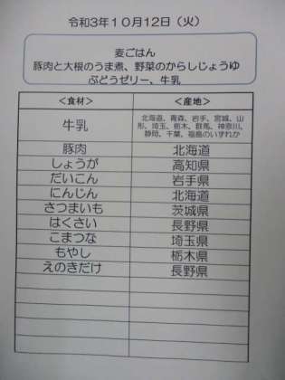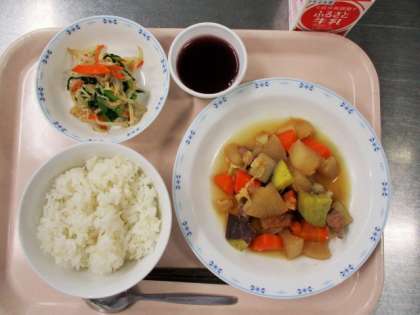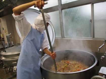 今日の煮物には豚肉、大根、こんにゃく、にんじん、さつまいも、さつまあげ、白菜が入っています。「味がしみた煮物がおいしかったです!」と子供たちから感想をもらいました。写真は煮物を作っているところです。