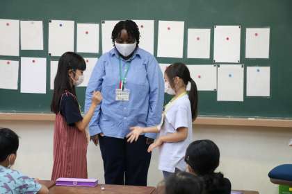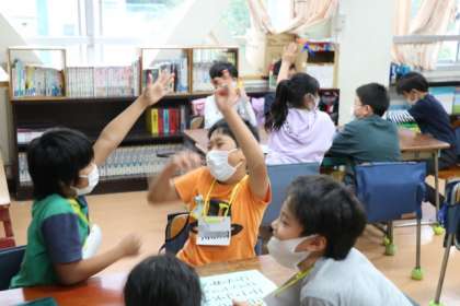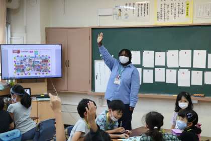 3年生ALTの先生と一緒に英語の学習の様子です。たくさんのアクティビティーをやりながら、積極的に英語を使ってみようとする意欲的な子供たちです。