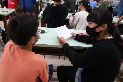 6年生家庭科「生活を豊かに」の学習の様子です。布でバックを作るために、どのような手順と方法で作ればいいか、紙を使って考えています。