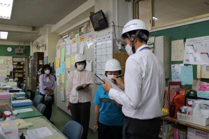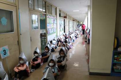 今日の避難訓練は家庭科室からの出火による避難です。本来なら校庭に避難しますが、今日は雨のため廊下整列までとしました。どのクラスも静かに並べています。「危険を予測して、自分で考えて行動しよう。」というめあてです。教室では、校庭も危険な時はどうする?と、二次避難の話も聞きました。
