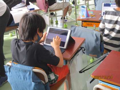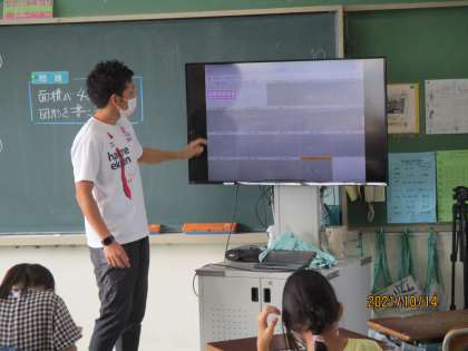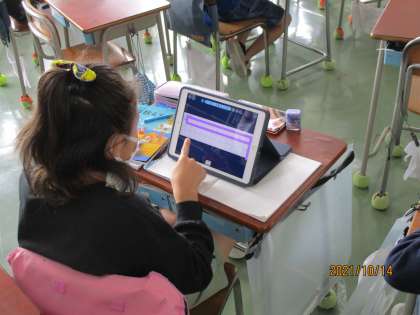4年生の算数です。「面積が4平方センチメートルになる図をかこう」という課題に取り組んでいます。みんなロイロノートの方眼紙にいろいろな形の4平方センチメートルをかいていました。
