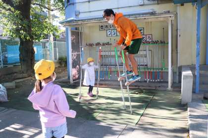朝遊びにたくさんの子が校庭に出てきます。先生が竹馬の練習をして乗れるようになった姿を見せてくれました。先生すごい!!
