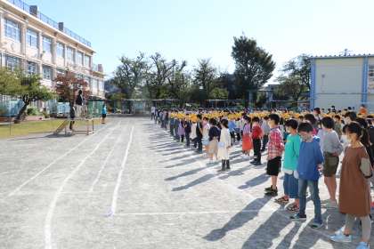 4月19日を最後に放送で行っていた全校朝会ですが、今週から校庭に集まっての全校朝会です。列の間を十分にあけて整列し、マスクを着用、おしゃべりはなしです。砧小学校の素晴らしいことのひとつに、全校児童が集合するとき先生が「静かにしましょう」という声を一切上げなくても、全員が静かに並べることがあります。整列したら口を閉じる。隣に並んでいる上級生がっやているので、みんなそれを手本にお喋り声が聞こえません。