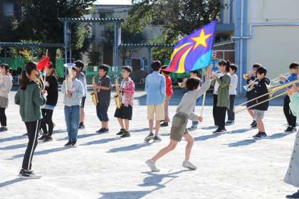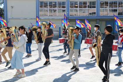 6年生音楽の様子です。鼓笛の全体練習です。動きながらの練習は難しそうですが、みんな頑張っています。