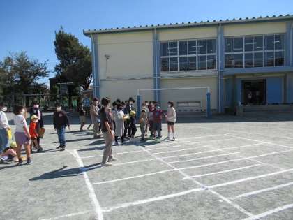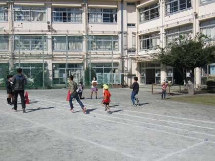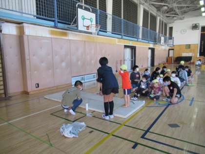 年長組さんが、スポーツテストを行いました。種目は25m走、立ち幅跳び、ソフトボール投げ、体支持、両足連続跳び越しです。5年生のお兄さんお姉さんがやり方のコツを教えてくれたり、記録をカードに書いてくれたりします。