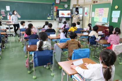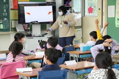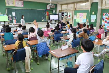 1年生外国語活動の様子です。歌に合わせて体の部分の言い方を繰り返し練習しました。目、耳、口、鼻覚えているでしょうか?