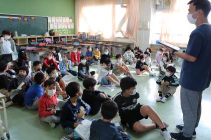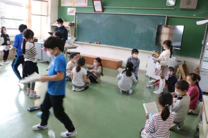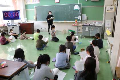 写真は、2年生が場面ごとに教室に分かれて台本の読み合わせをしている様子です。