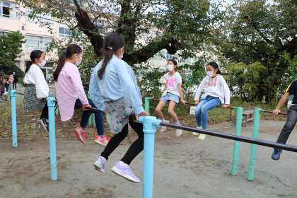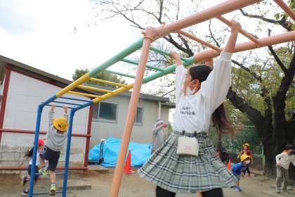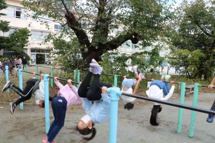 中休みの様子です。鉄棒で遊ぶお姉さんたち!!おもしろいことやってるよ・・・と1年生が教えてくれました。