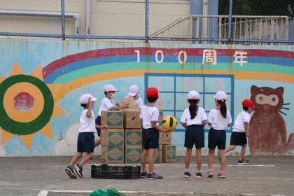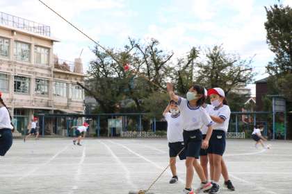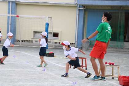 1年生体育「投げる」の学習の様子です。いろいろな「投」の場ができているので、子供たちも楽しみながら挑戦しています。