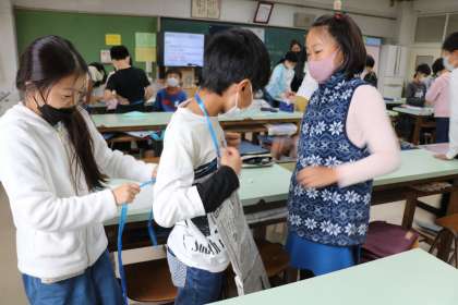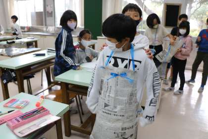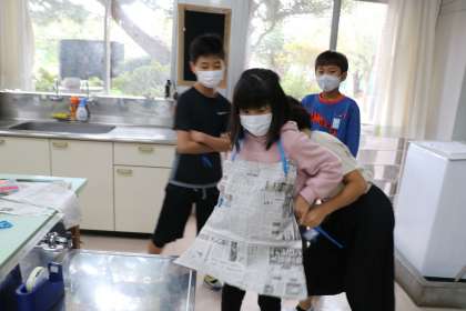 5年生家庭科「エプロン」つくりの様子です。新聞紙とひもを使って、エプロンの設計図を考えています。作り方を教えてもらうより、どのように作るといいのでしょう?あれこれ考えることが大切です。