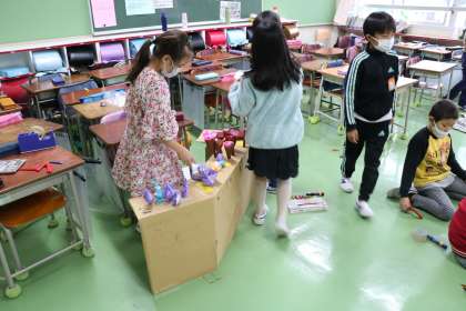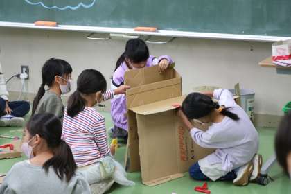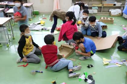 2年生の図工です。「あそんで ためして くふうして」というテーマで段ボールや色紙を使って思い思いの作品を作っていました。