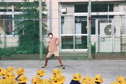 ジャベリックボールとは、長さ約32cm、重さ約140gの、後方に3枚の羽根を備えたラグビーボールのようなものを使う、投げの競技です。実際にみんなの前でやってもらいました。