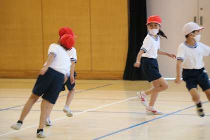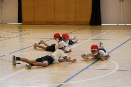 2年生の体育です。ピアノの音楽に合わせていろいろな動きに挑戦しています。曲調やリズムに合わせて上手に動くことができていました。