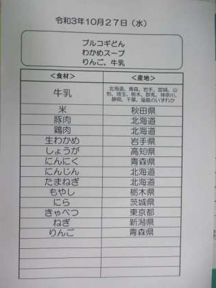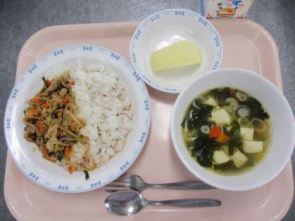 今日は韓国の料理です。少しピリ辛のコチジャンという韓国のみそを味付けに使っています。1年生でも食べられるくらいの辛さにしてあります。「少し辛いけどおいしいです。」と感想をもらいました。今日はどのクラスもほとんど完食していました。