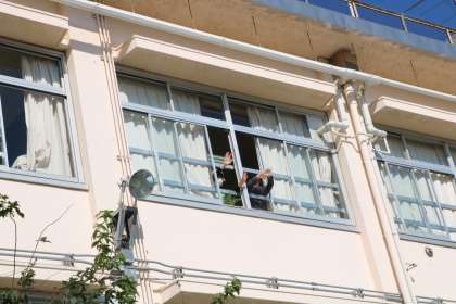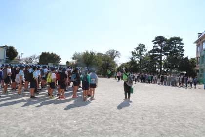 給食をゆっくり、しっかり食べて余裕をもって出発です。出発を5年生全員や窓から4年生が見送ってくれます。