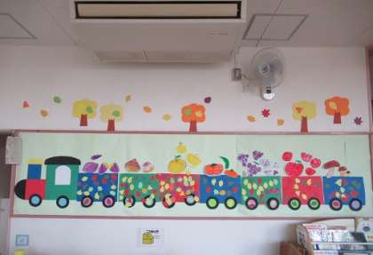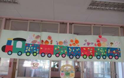 この写真は、はな組だよりで紹介されていた“たべもの列車”です。おいしそうなたべものがどっさり乗った、楽しい列車ができました!