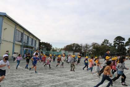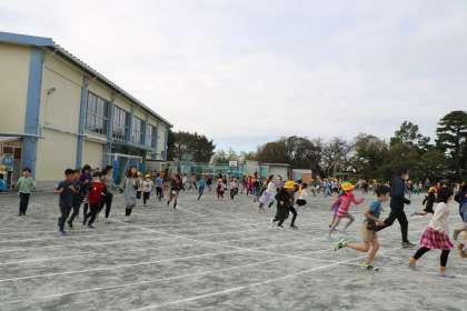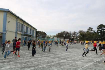 今朝は1・2・3年生のランランランです。後から走り始めた1年生をいちばん内側に入れてあげようと、走るペースを緩めて待ってあげる優しい3年生の姿があります。