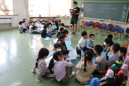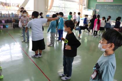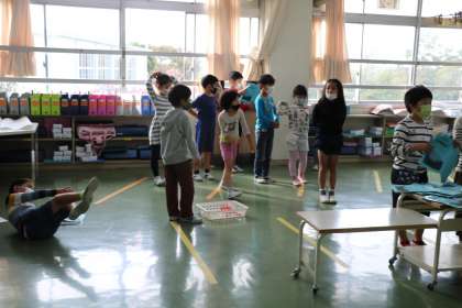 1年生の様子です。学芸会の台本の読み合わせをしています。舞台に見立てて床に線を引き、立つ位置を確認しながら練習するグループもあります。