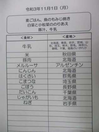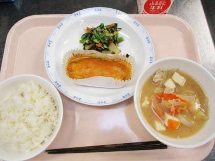「魚のもみじ焼き」は色づいてきた紅葉をイメージした料理です。魚の上にすりおろしたにんじんとマヨネーズ、みそ、みりん、酒、さとうを合わせてたれを作り、魚にのせて焼きました。「今日の魚がとってもおいしかったです。」とたくさんの子供たちから声をかけられました。