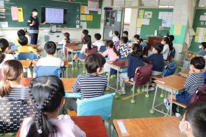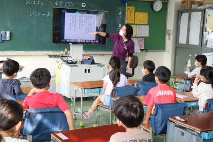 写真は1年生の様子です。途中に手拍子を入れるところもあり、担任の先生も一緒に練習しています。