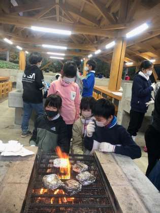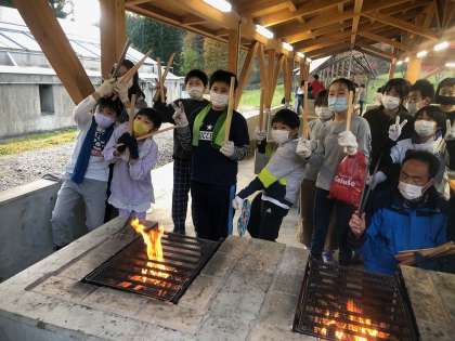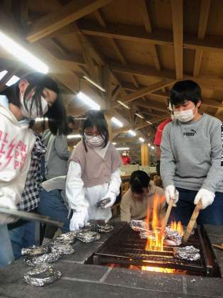 ?煙が目に染みますが、暖まりながら焼きリンゴ体験を楽しんでいます。焼き上がったリンゴは夕食の時にいただきます。