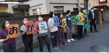 バスが学校近くに到着しました。たくさんの先生方、保護者の方が出迎えてくれています。