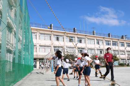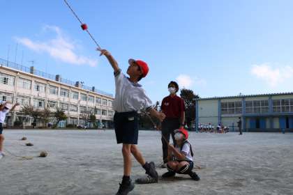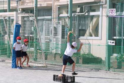 2年生体育の様子です。いろいろな場でボールを「投げる」ことを楽しみながら練習しています。