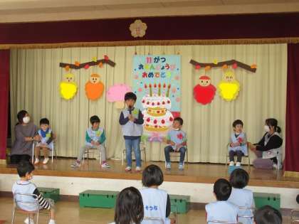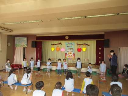 はな1組ほし1組の11月生まれの皆さんの誕生会でした。今日のお楽しみは、はな組さんの出し物です。ドングリを中に入れて作ったマラカスを使って、歌をうたってくれました。