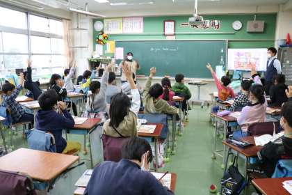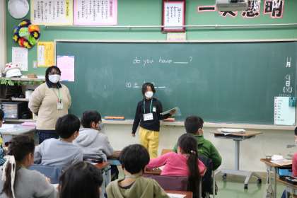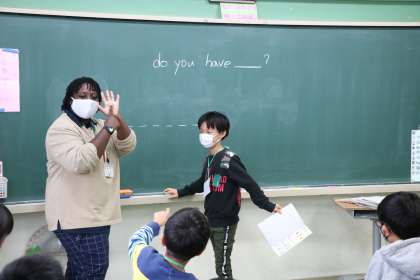 4年生の外国語の授業です。ALTの先生と一緒の授業です。今日は、「Do you have ○○○?」というセンテンスの使い方をクイズ形式で学習しました。どの子も意欲的にクイズに参加していました。