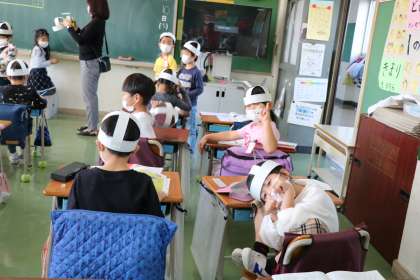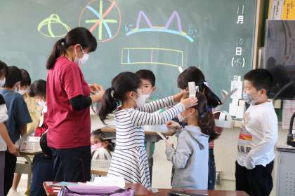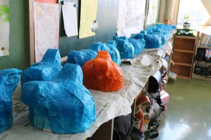 1年生の教室では、小道具作りが進んでいます。