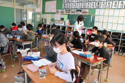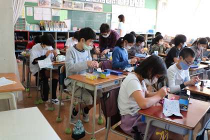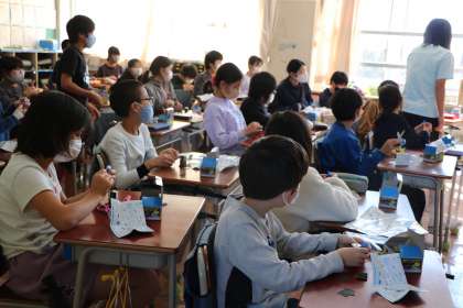 5年生理科「電流の流れと働き」の学習です。乾電池にエナメル線を巻きコイルを作っていきます。「根気よく丁寧に。」と先生が言うと「僕の最も苦手とすることです。」と言う子も、いつの間にか真剣に実験準備をしています。