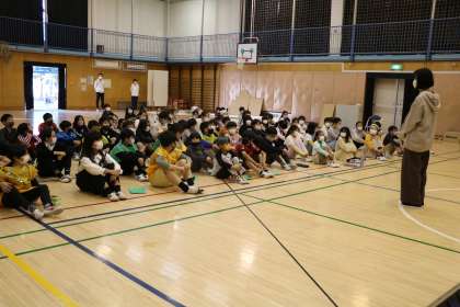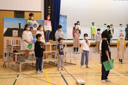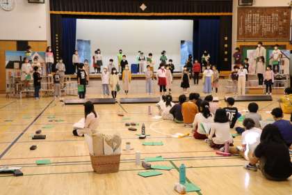 4年生学芸会の練習の様子です。立ち位置や場面のつなぎ部分の動き方を全員で確認しています。