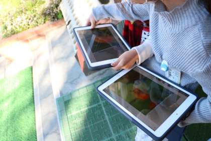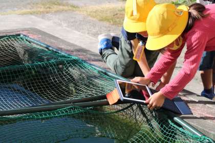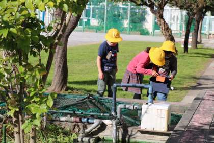 1年生が国語「しらせたいな、見せたいな」という取材メモを書く学習です。メモを書くために使う「生き物」の動きを動画や写真に収めています。玄関のメダカ、金魚、校庭の池のコイなどみんなで撮影しています。撮影したものを確認し、不足があれば再度挑戦しています。