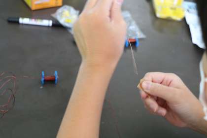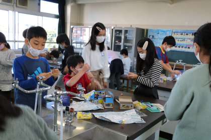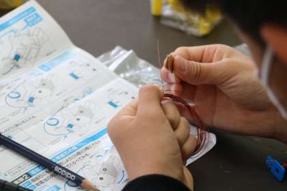 5年生理科「電気の流れ」の学習の様子です。エナメル線を100回巻いてコイルを作ります。エナメルの先はやすりで削ります。文字で書くと何とも単純で簡単そうですが、これがまた難しいのです。ここまでの準備の間、エナメルが絡まった、ねじれた、何回巻いたかわからなくなった・・・などなど。ようやく、協力しながら実験準備が完了です。
